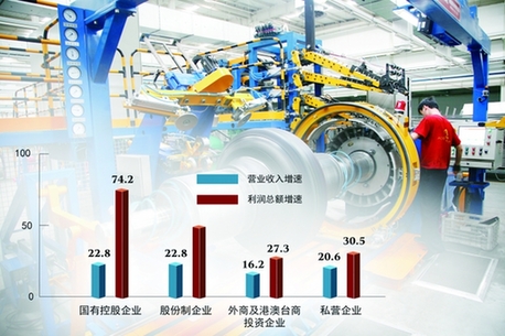 數(shù)據(jù)顯示,10月份私營企業(yè)利潤同比增長28.8%,增速較上月加快21個(gè)百分點(diǎn),連續(xù)兩個(gè)月回升。其中,有14個(gè)行業(yè)利潤增速在20%以上,呈現(xiàn)良好發(fā)展勢頭。私營企業(yè)對(duì)規(guī)模以上工業(yè)企業(yè)利潤增長的貢獻(xiàn)率為42.7%,較上月提高27.6個(gè)百分點(diǎn)。